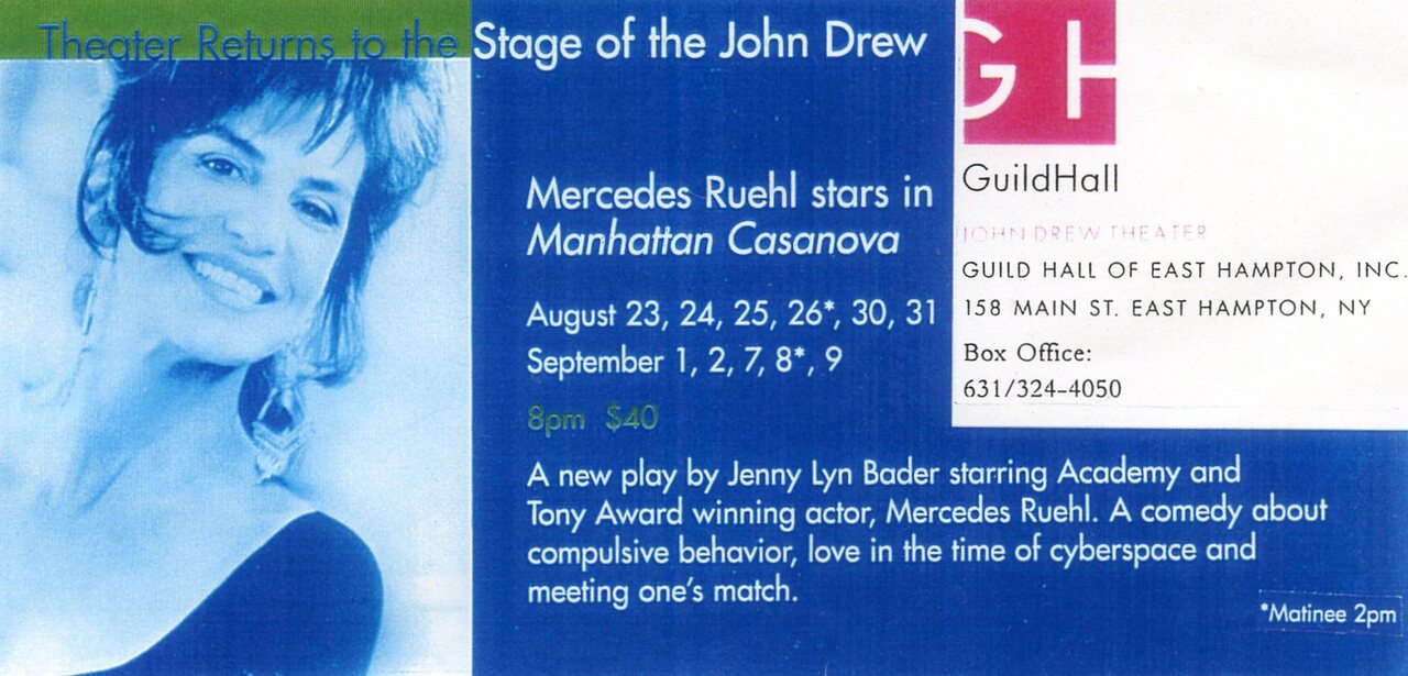 August typically means a suspension of therapy as analysts take summer vacation. How does that make you feel? Assuage those abandonment issues with Manhattan Casanova starring Academy and Tony Award-winning actress Mercedes Ruehl. Written by Jenny Lyn Bader... who Wendy Wasserstein described as her favorite young playwright, [Manhattan Casanova] explores what happens when a cynical psychiatrist finds herself facing a love epidemic... Don't be last on line for your chance to experience Bader's quirky take on love and relationships.