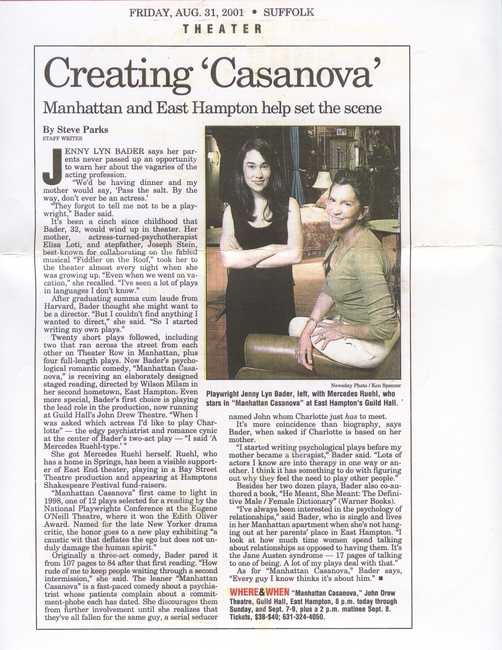 Production/Development History. Manhattan Casanova has had festival stagings and readings at theatres including: 45th St. Theatre (dir. Richard Caliban); Falcon Theatre, Los Angeles (w/ Tony Shalhoub, dir. Barnet Kellman); Neighborhood Playhouse (w/ David Alan Basche, dir. Chris Smith); Mulford Barn (w/ Roberta Wallach, dir. Chris Smith); Ultimate Female Protagonist Project/Mae West Fest, Seattle, WA (dir. Teresa Thuman); The New Group (w/ Rob Bogue, dir. Julie Kramer). And it was featured in the International Center for Women Playwrights' Chicago Her-rah "festival of the world's best women playwrights and their new plays."
