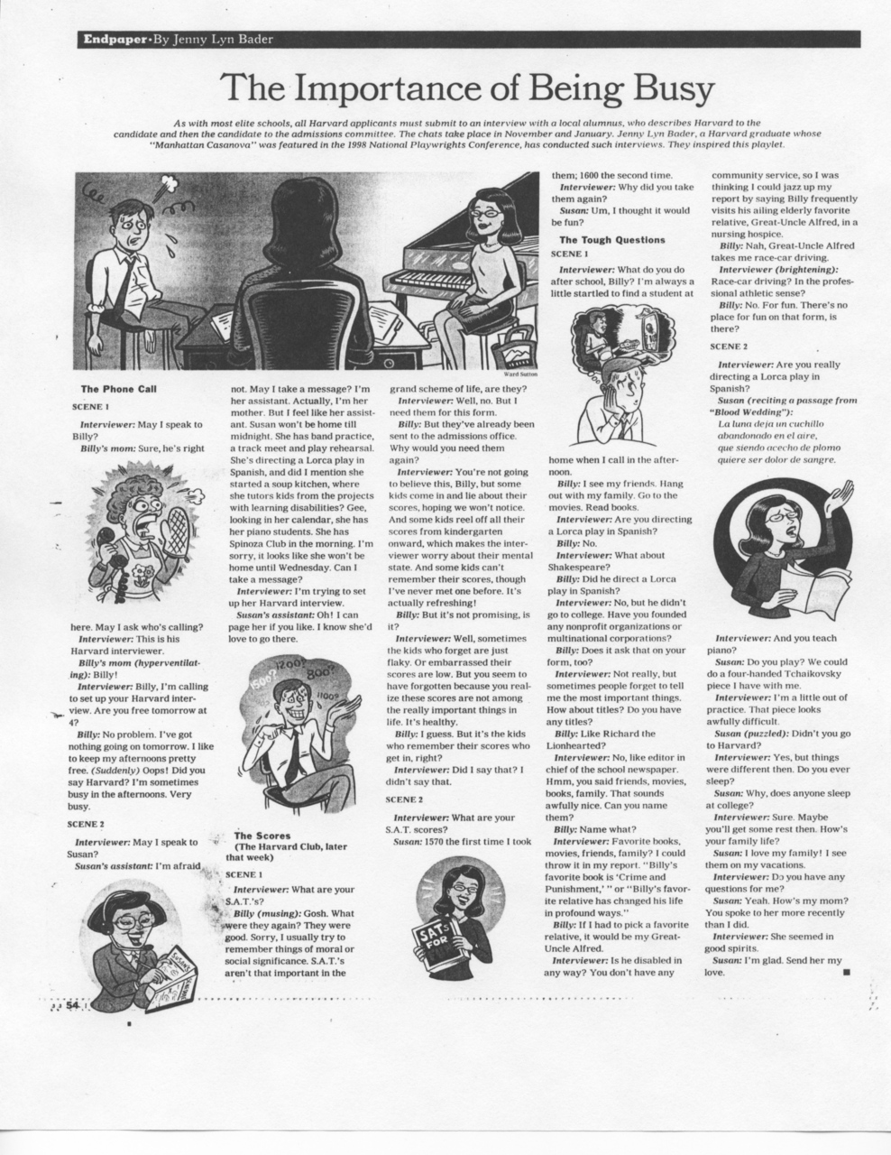 “The Importance of Being Busy,” (a short play about college admissions), Jan 1999