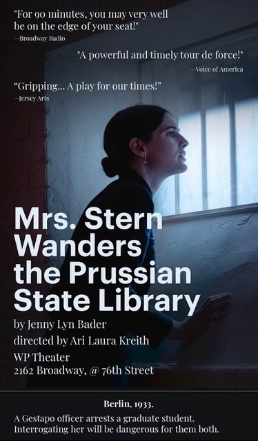 "Fascinating and historically accurate…surprising yet ultimately impactful… Jenny Lyn Bader is a writer of keen intelligence and insight… Ella Dershowitz is a lovely, sensitive actress of considerable range and depth…Mrs. Stern and its compelling cast makes us want to go back into our history books to learn more about this true event"